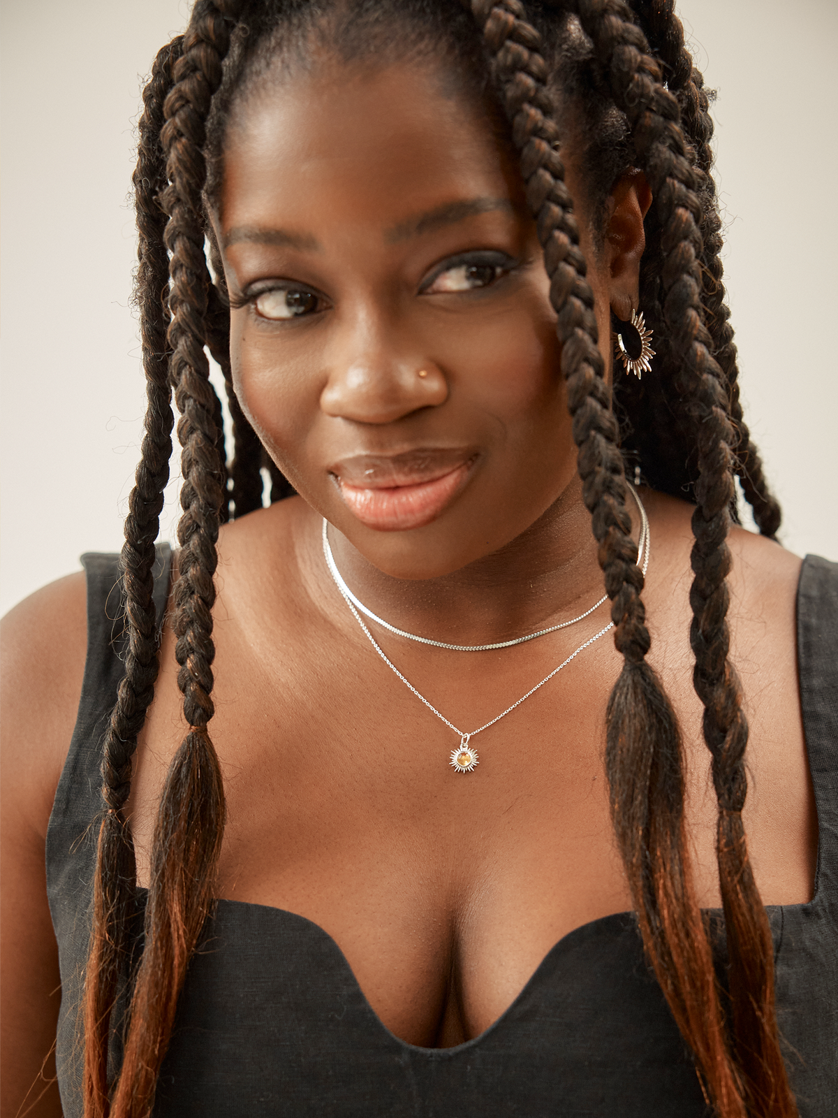 Choose Love. This limited edition, Clara Amfo x Rachel Jackson styled necklace set features a sleek serpentine chain paired with a hand-carved Citrine pendant set within a radiant Art Deco sun motif. This highly meaningful peice is a symbol of strength, personal power, and feel-good energy. A hidden, engraved message on the reverse, is a daily reminder to 'Choose Love'.